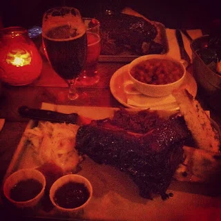 As I finish my pint we are ushered to our table, the decor is a simple range of exposed beams, floorboards and reclaimed furniture, this combined with a nice cosy level of lighting makes you feel instantly at home. The place is packed but doesn't feel oppressive or crowded, it just gives it a lively atmosphere that adds to your drinking and dining experience. The menu is a small selection of mains and sides, it's not particularly vegetarian friendly but that doesn't bother me because I'm here for barbecue! This is not barbecue in the outdoor, grilled British vein but instead in the American tradition. Slow cooked, smoked meats are the order of the day, the speciality is their ribs but they also offer burgers and pulled pork. We can't decide what to order so we both plump for a 'Greatest Hits' which features a selection of Duke's signature pork and beef ribs as well as pulled pork, slaw and some dips. We also order some pork 'n' beans because Dianne and I goddamn LOVE pork 'n' beans.