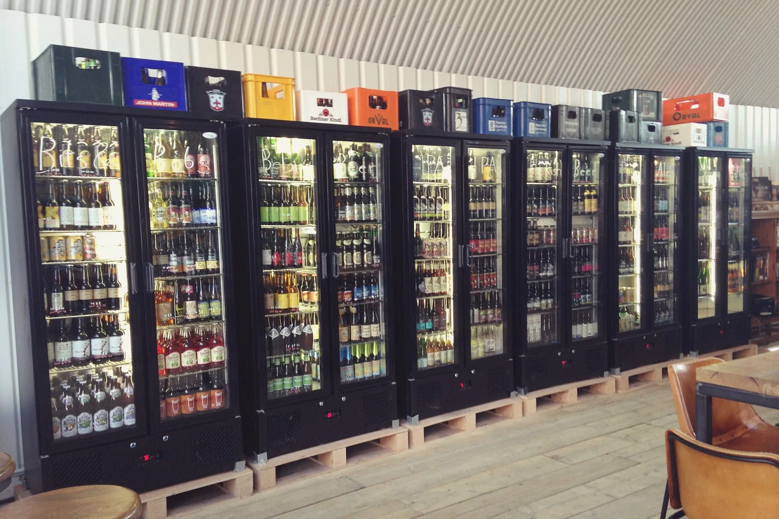 Picnic tables are laid out on a generously sized outdoor space and as you step inside your feet find wooden floorboards which add a softness to the urban surroundings. There are similar tables inside with chairs that look like they've been teleported from a 1970's classroom and right at the front are old oak barrels turned upright and surrounded by tall stools which are ideal for smaller parties. It's not the modest furnishings that your eyes are drawn to though as on your left are 6 huge fridges, gleaming with the multicoloured labels of beers from around the world and on top of these sit the kind of Belgian beer crates you wish you had at home for storing your own stash.