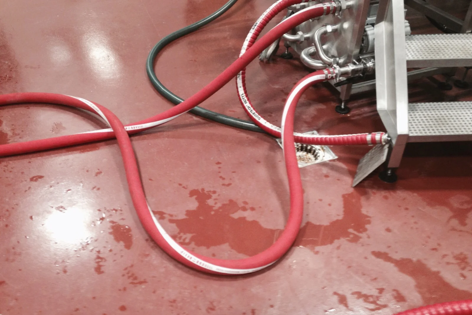 The brew day carries on apace and it's time to add the hops to our now boiling wort. The pellets fizz and explode as they hit the surface of the water each releasing its characteristic aromas as it does. We retire back to the bar for pizza and Horse and Dragons highly accomplished IPA, arguably there's no better food pairing, especially on a brew day. Even at lunch Cornish is dashing back to check the boil every few minutes, summoning me when it's time for the next hop addition. Once the boil is finished and it's stood for a few minutes after the aroma hops have been added, it's time to run the beer into the fermenter. Here I witness Cornish pitch yeast in line with the wort as it leaves the heat exchanger which she does using a modified keg to contain her yeast. She tells me that this gets fermentation started quicker, I'd never seen this done before but I sure took her word for it.